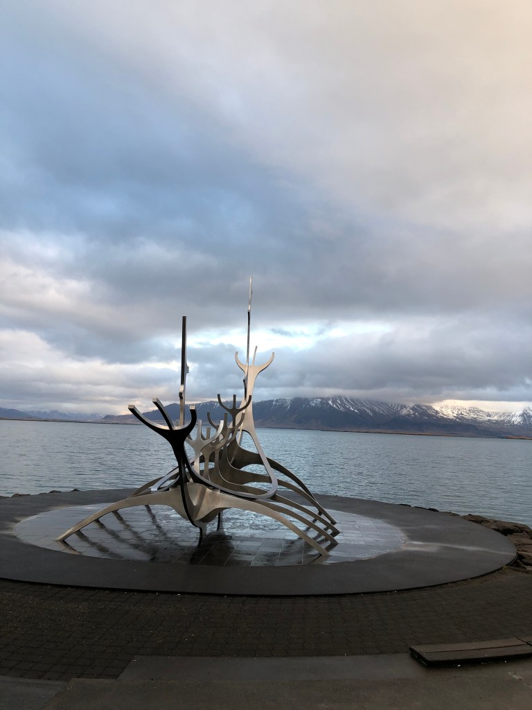 Right down on the harbor, there’s a famous Icelandic sculpture called the Sun Voyager. It was sculpted by Jón Gunnar Arnason, who designed it as an ode to the sun and as a dream boat, even though it looks like a Viking ship. It being situated right on the harbor gives it an incredible backdrop that really brings the whole “dream boat” thing to life!
